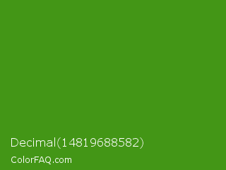 Decimal 14819688582 Color is a normal green color and the nearest color is Vida Loca #549019. Hex code #439616 and RGB value is rgb(67,150,22). In RGB color space, this color is composed of 26% red, 59% green, 9% blue, In CMYK color space, this color is composed of 55% cyan, 0% magenta, 85% yellow , 41% black , In HSL color space, this color has a hue angle of 99° , 74% saturation and 34% lightness.
