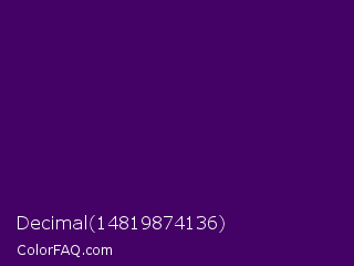 Decimal 14819874136 Color is a very dark purple color and the nearest color is Ripe Plum #410056. Hex code #440166 and RGB value is rgb(68,1,102). In RGB color space, this color is composed of 27% red, 0% green, 40% blue, In CMYK color space, this color is composed of 33% cyan, 99% magenta, 0% yellow , 60% black , In HSL color space, this color has a hue angle of 280° , 98% saturation and 20% lightness.