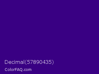 Decimal 57890435 Color is a dark violet color and the nearest color is Kingfisher Daisy #3e0480. Hex code #390083 and RGB value is rgb(57,0,131). In RGB color space, this color is composed of 22% red, 0% green, 51% blue, In CMYK color space, this color is composed of 56% cyan, 100% magenta, 0% yellow , 49% black , In HSL color space, this color has a hue angle of 266° , 100% saturation and 26% lightness.
