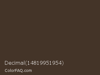 Decimal 14819951954 Color is a very dark orange color and the nearest color is Old Burgundy #43302e. Hex code #443428 and RGB value is rgb(68,52,40). In RGB color space, this color is composed of 27% red, 20% green, 16% blue, In CMYK color space, this color is composed of 0% cyan, 24% magenta, 41% yellow , 73% black , In HSL color space, this color has a hue angle of 26° , 26% saturation and 21% lightness.