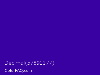 Decimal 57891177 Color is a normal violet color and the nearest color is Blue Gem #2c0e8c. Hex code #3901a1 and RGB value is rgb(57,1,161). In RGB color space, this color is composed of 22% red, 0% green, 63% blue, In CMYK color space, this color is composed of 65% cyan, 99% magenta, 0% yellow , 37% black , In HSL color space, this color has a hue angle of 261° , 99% saturation and 32% lightness.