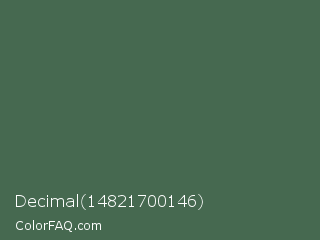 Decimal 14821700146 Color is a normal green color and the nearest color is Axolotl #4e6649. Hex code #466950 and RGB value is rgb(70,105,80). In RGB color space, this color is composed of 27% red, 41% green, 31% blue, In CMYK color space, this color is composed of 33% cyan, 0% magenta, 24% yellow , 59% black , In HSL color space, this color has a hue angle of 137° , 20% saturation and 34% lightness.
