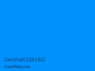 Decimal 226162 Color is a normal blue color and the nearest color is Azure Radiance #007fff. Hex code #0091fc and RGB value is rgb(0,145,252). In RGB color space, this color is composed of 0% red, 57% green, 99% blue, In CMYK color space, this color is composed of 100% cyan, 42% magenta, 0% yellow , 1% black , In HSL color space, this color has a hue angle of 205° , 100% saturation and 49% lightness.