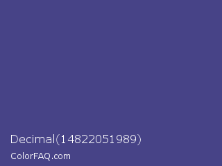 Decimal 14822051989 Color is a normal indigo color and the nearest color is Dark Slate Blue #483d8b. Hex code #474387 and RGB value is rgb(71,67,135). In RGB color space, this color is composed of 28% red, 26% green, 53% blue, In CMYK color space, this color is composed of 47% cyan, 50% magenta, 0% yellow , 47% black , In HSL color space, this color has a hue angle of 244° , 34% saturation and 40% lightness.