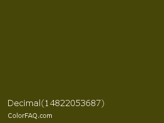 Decimal 14822053687 Color is a very dark yellow color and the nearest color is Bronze Olive #4e420c. Hex code #474609 and RGB value is rgb(71,70,9). In RGB color space, this color is composed of 28% red, 27% green, 4% blue, In CMYK color space, this color is composed of 0% cyan, 1% magenta, 87% yellow , 72% black , In HSL color space, this color has a hue angle of 59° , 78% saturation and 16% lightness.