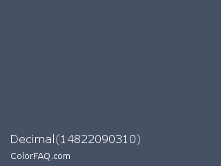 Decimal 14822090310 Color is a normal blue color and the nearest color is Fiord #405169. Hex code #475166 and RGB value is rgb(71,81,102). In RGB color space, this color is composed of 28% red, 32% green, 40% blue, In CMYK color space, this color is composed of 30% cyan, 21% magenta, 0% yellow , 60% black , In HSL color space, this color has a hue angle of 221° , 18% saturation and 34% lightness.