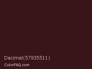 Decimal 57935511 Color is a very dark red color and the nearest color is Dark Sienna #3c1414. Hex code #391419 and RGB value is rgb(57,20,25). In RGB color space, this color is composed of 22% red, 8% green, 10% blue, In CMYK color space, this color is composed of 0% cyan, 65% magenta, 56% yellow , 78% black , In HSL color space, this color has a hue angle of 352° , 48% saturation and 15% lightness.