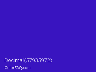 Decimal 57935972 Color is a normal indigo color and the nearest color is Interdimensional Blue #360ccc. Hex code #3914c0 and RGB value is rgb(57,20,192). In RGB color space, this color is composed of 22% red, 8% green, 75% blue, In CMYK color space, this color is composed of 70% cyan, 90% magenta, 0% yellow , 25% black , In HSL color space, this color has a hue angle of 253° , 81% saturation and 42% lightness.