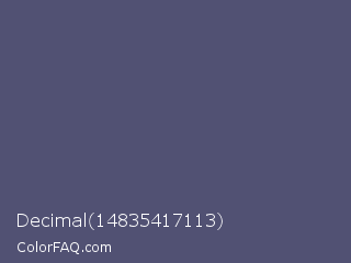 Decimal 14835417113 Color is a normal blue color and the nearest color is Independence #4c516d. Hex code #515173 and RGB value is rgb(81,81,115). In RGB color space, this color is composed of 32% red, 32% green, 45% blue, In CMYK color space, this color is composed of 30% cyan, 30% magenta, 0% yellow , 55% black , In HSL color space, this color has a hue angle of 240° , 17% saturation and 38% lightness.