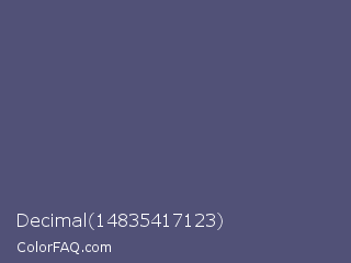 Decimal 14835417123 Color is a normal blue color and the nearest color is Purple Navy #4e5180. Hex code #515177 and RGB value is rgb(81,81,119). In RGB color space, this color is composed of 32% red, 32% green, 47% blue, In CMYK color space, this color is composed of 32% cyan, 32% magenta, 0% yellow , 53% black , In HSL color space, this color has a hue angle of 240° , 19% saturation and 39% lightness.