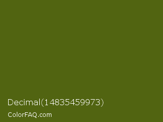 Decimal 14835459973 Color is a dark lime color and the nearest color is Saratoga #555b10. Hex code #516411 and RGB value is rgb(81,100,17). In RGB color space, this color is composed of 32% red, 39% green, 7% blue, In CMYK color space, this color is composed of 19% cyan, 0% magenta, 83% yellow , 61% black , In HSL color space, this color has a hue angle of 74° , 71% saturation and 23% lightness.