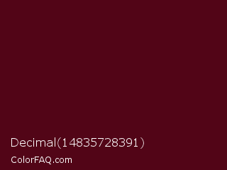 Decimal 14835728391 Color is a very dark red color and the nearest color is Dark Scarlet #560319. Hex code #520517 and RGB value is rgb(82,5,23). In RGB color space, this color is composed of 32% red, 2% green, 9% blue, In CMYK color space, this color is composed of 0% cyan, 94% magenta, 72% yellow , 68% black , In HSL color space, this color has a hue angle of 346° , 89% saturation and 17% lightness.