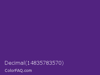 Decimal 14835783570 Color is a normal violet color and the nearest color is Spanish Violet #4c2882. Hex code #522380 and RGB value is rgb(82,35,128). In RGB color space, this color is composed of 32% red, 14% green, 50% blue, In CMYK color space, this color is composed of 36% cyan, 73% magenta, 0% yellow , 50% black , In HSL color space, this color has a hue angle of 270° , 57% saturation and 32% lightness.