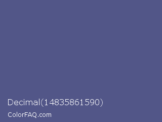 Decimal 14835861590 Color is a normal blue color and the nearest color is Purple Navy #4e5180. Hex code #525688 and RGB value is rgb(82,86,136). In RGB color space, this color is composed of 32% red, 34% green, 53% blue, In CMYK color space, this color is composed of 40% cyan, 37% magenta, 0% yellow , 47% black , In HSL color space, this color has a hue angle of 236° , 25% saturation and 43% lightness.