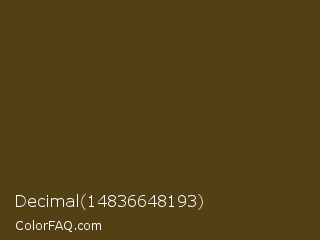 Decimal 14836648193 Color is a very dark orange color and the nearest color is Punga #4d3d14. Hex code #534115 and RGB value is rgb(83,65,21). In RGB color space, this color is composed of 33% red, 25% green, 8% blue, In CMYK color space, this color is composed of 0% cyan, 22% magenta, 75% yellow , 67% black , In HSL color space, this color has a hue angle of 43° , 60% saturation and 20% lightness.