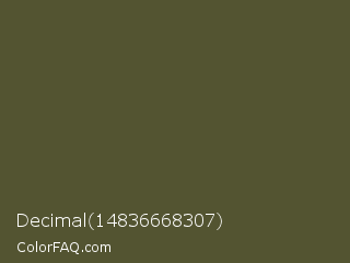 Decimal 14836668307 Color is a dark yellow color and the nearest color is Woodland #4d5328. Hex code #535431 and RGB value is rgb(83,84,49). In RGB color space, this color is composed of 33% red, 33% green, 19% blue, In CMYK color space, this color is composed of 1% cyan, 0% magenta, 42% yellow , 67% black , In HSL color space, this color has a hue angle of 62° , 26% saturation and 26% lightness.