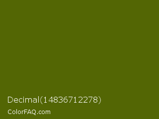 Decimal 14836712278 Color is a very dark lime color and the nearest color is Saratoga #555b10. Hex code #536604 and RGB value is rgb(83,102,4). In RGB color space, this color is composed of 33% red, 40% green, 2% blue, In CMYK color space, this color is composed of 19% cyan, 0% magenta, 96% yellow , 60% black , In HSL color space, this color has a hue angle of 72° , 92% saturation and 21% lightness.