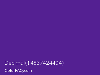 Decimal 14837424404 Color is a normal violet color and the nearest color is Daisy Bush #4f2398. Hex code #542092 and RGB value is rgb(84,32,146). In RGB color space, this color is composed of 33% red, 13% green, 57% blue, In CMYK color space, this color is composed of 42% cyan, 78% magenta, 0% yellow , 43% black , In HSL color space, this color has a hue angle of 267° , 64% saturation and 35% lightness.