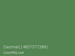 Decimal 14837577289 Color is a normal green color and the nearest color is Hippie Green #53824b. Hex code #548451 and RGB value is rgb(84,132,81). In RGB color space, this color is composed of 33% red, 52% green, 32% blue, In CMYK color space, this color is composed of 36% cyan, 0% magenta, 39% yellow , 48% black , In HSL color space, this color has a hue angle of 116° , 24% saturation and 42% lightness.