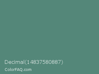 Decimal 14837580887 Color is a normal cyan color and the nearest color is Wintergreen Dream #56887d. Hex code #548779 and RGB value is rgb(84,135,121). In RGB color space, this color is composed of 33% red, 53% green, 47% blue, In CMYK color space, this color is composed of 38% cyan, 0% magenta, 10% yellow , 47% black , In HSL color space, this color has a hue angle of 164° , 23% saturation and 43% lightness.