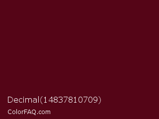 Decimal 14837810709 Color is a very dark red color and the nearest color is Dark Scarlet #560319. Hex code #550517 and RGB value is rgb(85,5,23). In RGB color space, this color is composed of 33% red, 2% green, 9% blue, In CMYK color space, this color is composed of 0% cyan, 94% magenta, 73% yellow , 67% black , In HSL color space, this color has a hue angle of 347° , 89% saturation and 18% lightness.