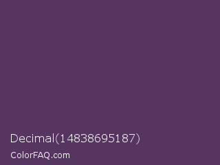 Decimal 14838695187 Color is a dark purple color and the nearest color is English Violet #563c5c. Hex code #563561 and RGB value is rgb(86,53,97). In RGB color space, this color is composed of 34% red, 21% green, 38% blue, In CMYK color space, this color is composed of 11% cyan, 45% magenta, 0% yellow , 62% black , In HSL color space, this color has a hue angle of 285° , 29% saturation and 29% lightness.