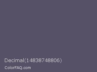 Decimal 14838748806 Color is a normal indigo color and the nearest color is Scarpa Flow #585562. Hex code #565166 and RGB value is rgb(86,81,102). In RGB color space, this color is composed of 34% red, 32% green, 40% blue, In CMYK color space, this color is composed of 16% cyan, 21% magenta, 0% yellow , 60% black , In HSL color space, this color has a hue angle of 254° , 11% saturation and 36% lightness.