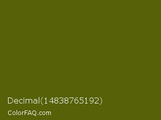Decimal 14838765192 Color is a very dark yellow color and the nearest color is Saratoga #555b10. Hex code #566108 and RGB value is rgb(86,97,8). In RGB color space, this color is composed of 34% red, 38% green, 3% blue, In CMYK color space, this color is composed of 11% cyan, 0% magenta, 92% yellow , 62% black , In HSL color space, this color has a hue angle of 67° , 85% saturation and 21% lightness.