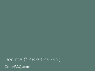 Decimal 14839649395 Color is a normal cyan color and the nearest color is Cutty Sark #507672. Hex code #577971 and RGB value is rgb(87,121,113). In RGB color space, this color is composed of 34% red, 47% green, 44% blue, In CMYK color space, this color is composed of 28% cyan, 0% magenta, 7% yellow , 53% black , In HSL color space, this color has a hue angle of 166° , 16% saturation and 41% lightness.