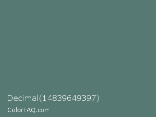 Decimal 14839649397 Color is a normal cyan color and the nearest color is Cutty Sark #507672. Hex code #577973 and RGB value is rgb(87,121,115). In RGB color space, this color is composed of 34% red, 47% green, 45% blue, In CMYK color space, this color is composed of 28% cyan, 0% magenta, 5% yellow , 53% black , In HSL color space, this color has a hue angle of 169° , 16% saturation and 41% lightness.