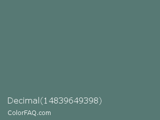 Decimal 14839649398 Color is a normal cyan color and the nearest color is Cutty Sark #507672. Hex code #577974 and RGB value is rgb(87,121,116). In RGB color space, this color is composed of 34% red, 47% green, 45% blue, In CMYK color space, this color is composed of 28% cyan, 0% magenta, 4% yellow , 53% black , In HSL color space, this color has a hue angle of 171° , 16% saturation and 41% lightness.