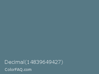 Decimal 14839649427 Color is a normal blue color and the nearest color is Smalt Blue #51808f. Hex code #577985 and RGB value is rgb(87,121,133). In RGB color space, this color is composed of 34% red, 47% green, 52% blue, In CMYK color space, this color is composed of 35% cyan, 9% magenta, 0% yellow , 48% black , In HSL color space, this color has a hue angle of 196° , 21% saturation and 43% lightness.