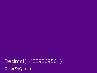 Decimal 14839869561 Color is a dark purple color and the nearest color is Pigment Indigo #4b0082. Hex code #580487 and RGB value is rgb(88,4,135). In RGB color space, this color is composed of 35% red, 2% green, 53% blue, In CMYK color space, this color is composed of 35% cyan, 97% magenta, 0% yellow , 47% black , In HSL color space, this color has a hue angle of 278° , 94% saturation and 27% lightness.