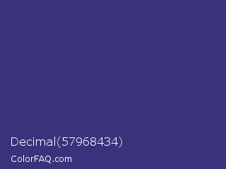 Decimal 57968434 Color is a normal indigo color and the nearest color is Minsk #3f307f. Hex code #39337c and RGB value is rgb(57,51,124). In RGB color space, this color is composed of 22% red, 20% green, 49% blue, In CMYK color space, this color is composed of 54% cyan, 59% magenta, 0% yellow , 51% black , In HSL color space, this color has a hue angle of 245° , 42% saturation and 34% lightness.