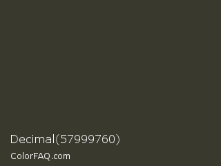 Decimal 57999760 Color is a very dark yellow color and the nearest color is Dune #383533. Hex code #39392e and RGB value is rgb(57,57,46). In RGB color space, this color is composed of 22% red, 22% green, 18% blue, In CMYK color space, this color is composed of 0% cyan, 0% magenta, 19% yellow , 78% black , In HSL color space, this color has a hue angle of 60° , 11% saturation and 20% lightness.