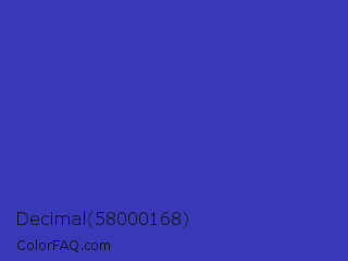 Decimal 58000168 Color is a normal blue color and the nearest color is Governor Bay #2f3cb3. Hex code #3939b8 and RGB value is rgb(57,57,184). In RGB color space, this color is composed of 22% red, 22% green, 72% blue, In CMYK color space, this color is composed of 69% cyan, 69% magenta, 0% yellow , 28% black , In HSL color space, this color has a hue angle of 240° , 53% saturation and 47% lightness.