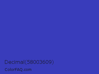 Decimal 58003609 Color is a normal blue color and the nearest color is Governor Bay #2f3cb3. Hex code #393cbb and RGB value is rgb(57,60,187). In RGB color space, this color is composed of 22% red, 24% green, 73% blue, In CMYK color space, this color is composed of 70% cyan, 68% magenta, 0% yellow , 27% black , In HSL color space, this color has a hue angle of 239° , 53% saturation and 48% lightness.