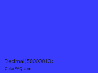 Decimal 58003813 Color is a light blue color and the nearest color is Palatinate Blue #273be2. Hex code #393cfd and RGB value is rgb(57,60,253). In RGB color space, this color is composed of 22% red, 24% green, 99% blue, In CMYK color space, this color is composed of 77% cyan, 76% magenta, 0% yellow , 1% black , In HSL color space, this color has a hue angle of 239° , 98% saturation and 61% lightness.