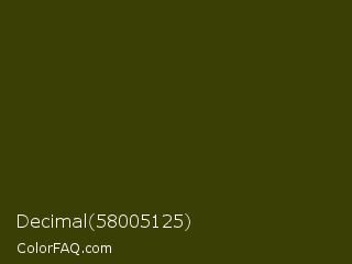 Decimal 58005125 Color is a very dark yellow color and the nearest color is Waiouru #363c0d. Hex code #393f05 and RGB value is rgb(57,63,5). In RGB color space, this color is composed of 22% red, 25% green, 2% blue, In CMYK color space, this color is composed of 10% cyan, 0% magenta, 92% yellow , 75% black , In HSL color space, this color has a hue angle of 66° , 85% saturation and 13% lightness.