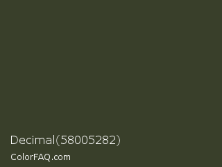 Decimal 58005282 Color is a very dark lime color and the nearest color is Kombu Green #354230. Hex code #393f2a and RGB value is rgb(57,63,42). In RGB color space, this color is composed of 22% red, 25% green, 16% blue, In CMYK color space, this color is composed of 10% cyan, 0% magenta, 33% yellow , 75% black , In HSL color space, this color has a hue angle of 77° , 20% saturation and 21% lightness.