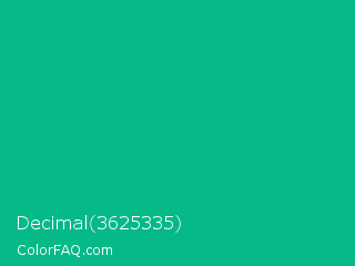 Decimal 3625335 Color is a normal cyan color and the nearest color is Persian Green #00a693. Hex code #05b989 and RGB value is rgb(5,185,137). In RGB color space, this color is composed of 2% red, 73% green, 54% blue, In CMYK color space, this color is composed of 97% cyan, 0% magenta, 26% yellow , 27% black , In HSL color space, this color has a hue angle of 164° , 95% saturation and 37% lightness.