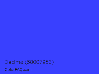 Decimal 58007953 Color is a light blue color and the nearest color is Palatinate Blue #273be2. Hex code #3940ff and RGB value is rgb(57,64,255). In RGB color space, this color is composed of 22% red, 25% green, 100% blue, In CMYK color space, this color is composed of 78% cyan, 75% magenta, 0% yellow , 0% black , In HSL color space, this color has a hue angle of 238° , 100% saturation and 61% lightness.