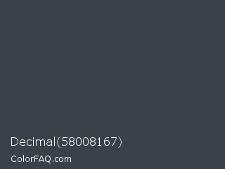 Decimal 58008167 Color is a dark blue color and the nearest color is Arsenic #3b444b. Hex code #39414b and RGB value is rgb(57,65,75). In RGB color space, this color is composed of 22% red, 25% green, 29% blue, In CMYK color space, this color is composed of 24% cyan, 13% magenta, 0% yellow , 71% black , In HSL color space, this color has a hue angle of 213° , 14% saturation and 26% lightness.