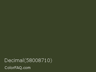 Decimal 58008710 Color is a very dark lime color and the nearest color is Kombu Green #354230. Hex code #394226 and RGB value is rgb(57,66,38). In RGB color space, this color is composed of 22% red, 26% green, 15% blue, In CMYK color space, this color is composed of 14% cyan, 0% magenta, 42% yellow , 74% black , In HSL color space, this color has a hue angle of 79° , 27% saturation and 20% lightness.