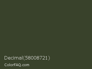 Decimal 58008721 Color is a very dark green color and the nearest color is Kombu Green #354230. Hex code #39422b and RGB value is rgb(57,66,43). In RGB color space, this color is composed of 22% red, 26% green, 17% blue, In CMYK color space, this color is composed of 14% cyan, 0% magenta, 35% yellow , 74% black , In HSL color space, this color has a hue angle of 83° , 21% saturation and 21% lightness.