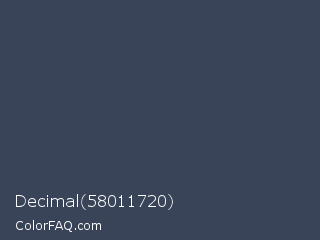 Decimal 58011720 Color is a dark blue color and the nearest color is Oxford Blue #384555. Hex code #394458 and RGB value is rgb(57,68,88). In RGB color space, this color is composed of 22% red, 27% green, 35% blue, In CMYK color space, this color is composed of 35% cyan, 23% magenta, 0% yellow , 65% black , In HSL color space, this color has a hue angle of 219° , 21% saturation and 28% lightness.