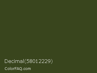 Decimal 58012229 Color is a very dark lime color and the nearest color is Thatch Green #403d19. Hex code #39451d and RGB value is rgb(57,69,29). In RGB color space, this color is composed of 22% red, 27% green, 11% blue, In CMYK color space, this color is composed of 17% cyan, 0% magenta, 58% yellow , 73% black , In HSL color space, this color has a hue angle of 78° , 41% saturation and 19% lightness.