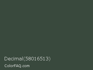 Decimal 58016513 Color is a dark green color and the nearest color is Lunar Green #3c493a. Hex code #39493d and RGB value is rgb(57,73,61). In RGB color space, this color is composed of 22% red, 29% green, 24% blue, In CMYK color space, this color is composed of 22% cyan, 0% magenta, 16% yellow , 71% black , In HSL color space, this color has a hue angle of 135° , 12% saturation and 25% lightness.