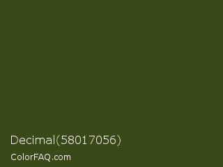 Decimal 58017056 Color is a very dark green color and the nearest color is Clover #384910. Hex code #394a18 and RGB value is rgb(57,74,24). In RGB color space, this color is composed of 22% red, 29% green, 9% blue, In CMYK color space, this color is composed of 23% cyan, 0% magenta, 68% yellow , 71% black , In HSL color space, this color has a hue angle of 80° , 51% saturation and 19% lightness.