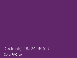 Decimal 14852444961 Color is a dark magenta color and the nearest color is Imperial #602f6b. Hex code #612569 and RGB value is rgb(97,37,105). In RGB color space, this color is composed of 38% red, 15% green, 41% blue, In CMYK color space, this color is composed of 8% cyan, 65% magenta, 0% yellow , 59% black , In HSL color space, this color has a hue angle of 293° , 48% saturation and 28% lightness.
